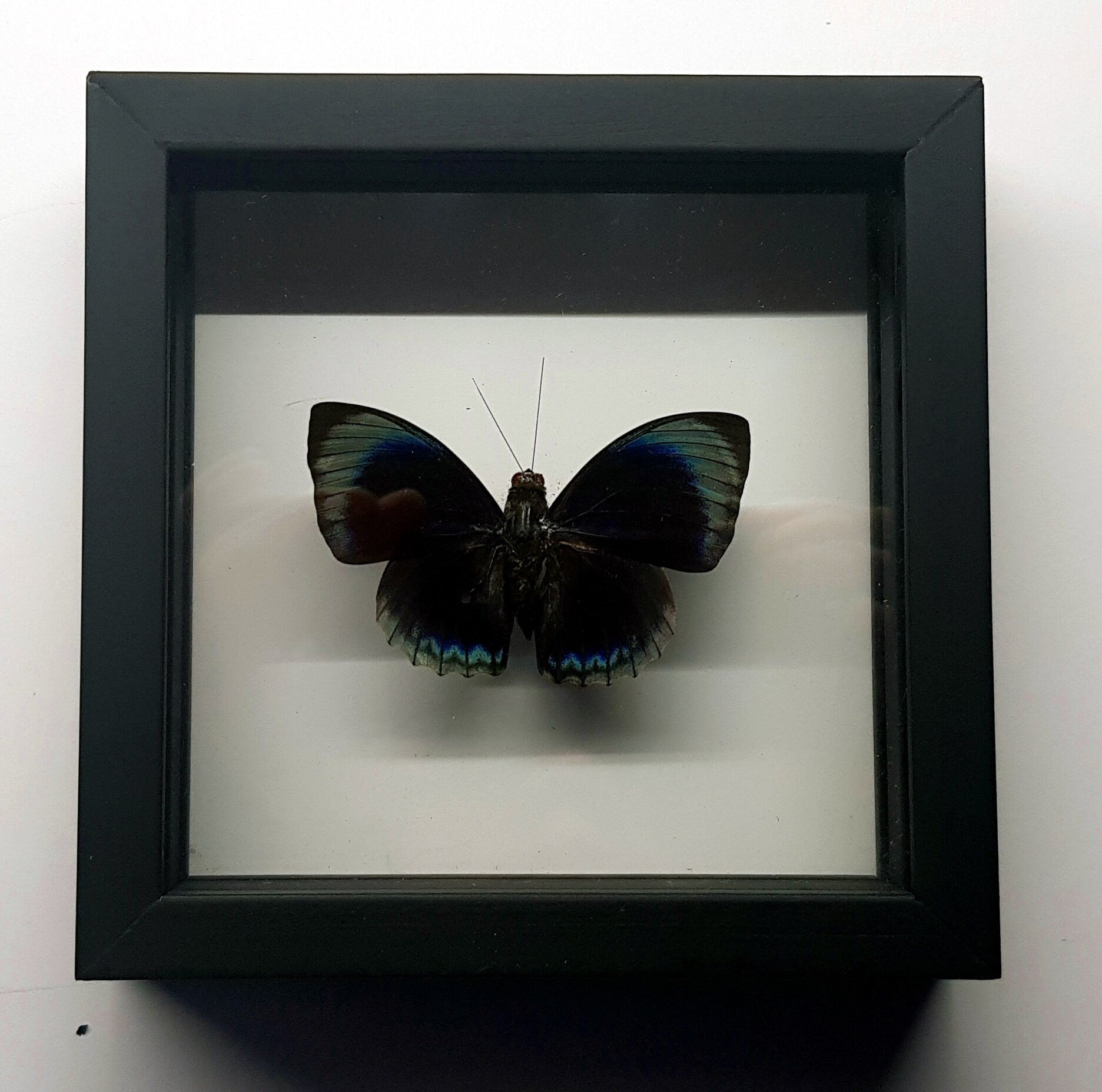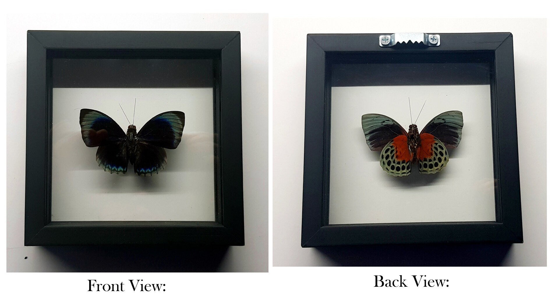 (Also available in wood finish frame) Size:7x7 inchesBeautifully framed in a double glass shadow box.The double glass shadow box allows you to appreciate both the front patterns as well as the back patterns of the butterfly witch can be radically different. This Rustic hand painted & framed butterfly adds a great decorative touch to any living room, office or study. Also makes a fantastic high quality gift on any occasion. For any questions feel free to send me a message.Ships with 3 layers of protection for a guaranteed safe arrival. Full refund if damaged in transit.