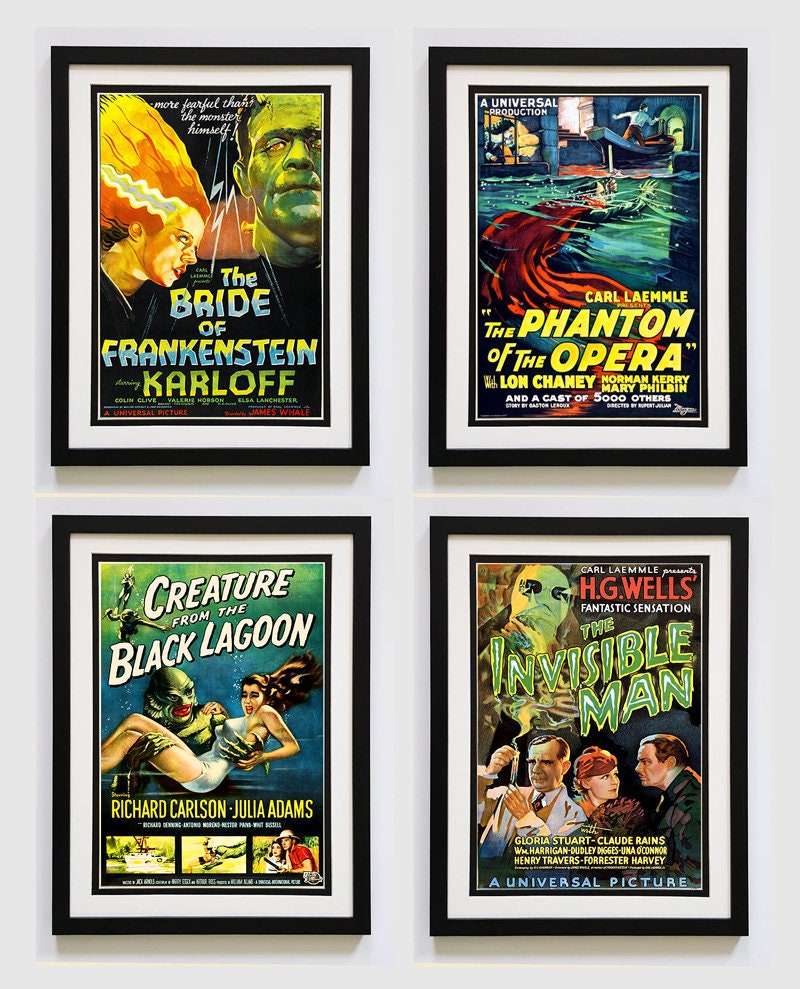 B Movie Classic Monster Set. This set includes the film posters of Bride of Frankenstein, Invisible Man, Creature From the Black Lagoon and Phantom of the Opera