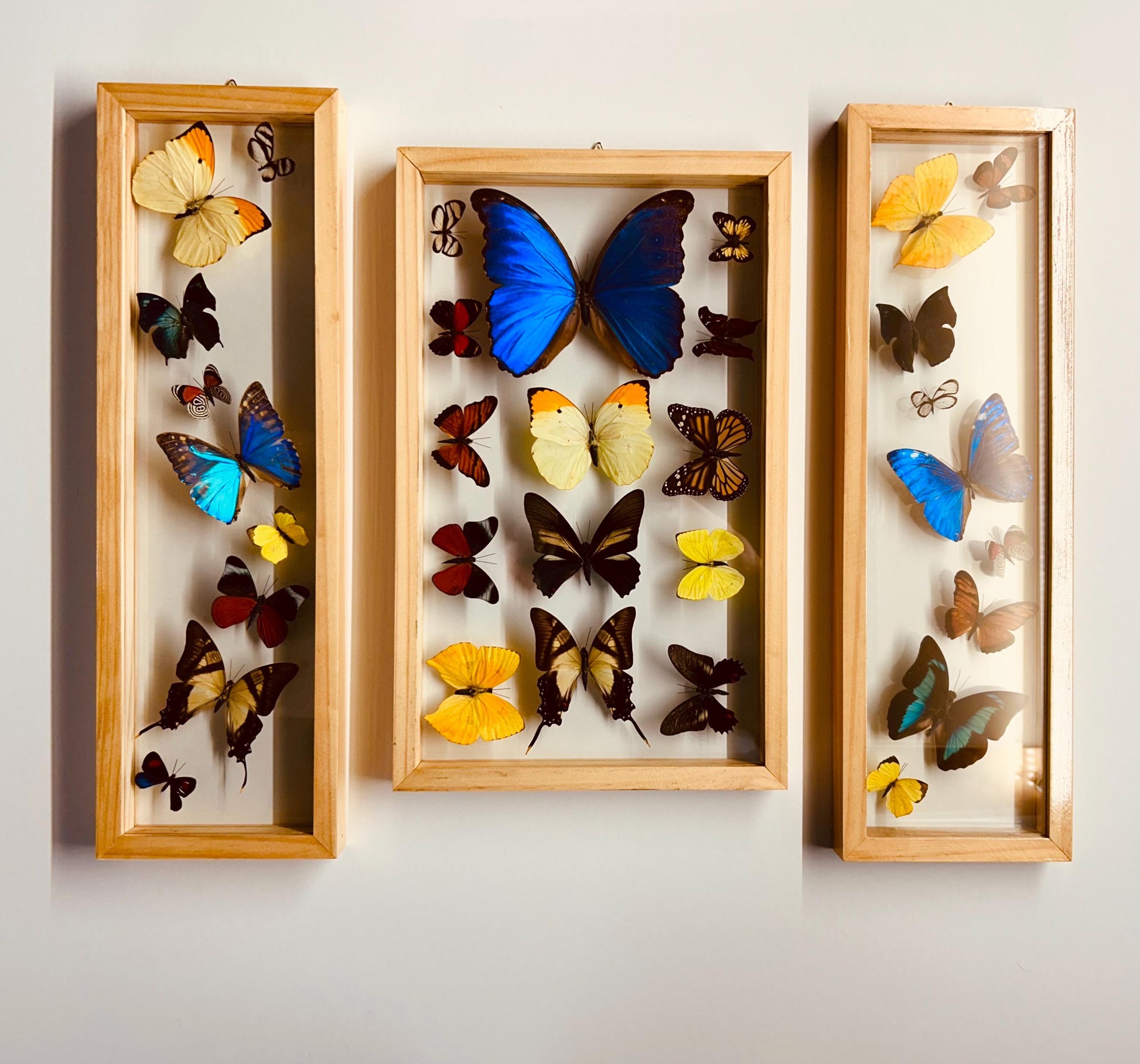(Includes 3 framed displays) Size=6x19,16x12, 6x19 inches (Some of the small butterflies may differ from the sample image)Beautifully framed Amazonian butterfly specimens in a double glass shadow box.The double glass shadow box allows you to appreciate both the front patterns as well as the back patterns of the butterflies witch can be radically different. This Rustic hand painted & framed butterfly collection adds a great decorative touch to any living room, office or study. Also makes a fantastic high quality gift on any occasion. For any questions feel free to send me a message.Ships with 3 layers of protection for a guaranteed safe arrival.