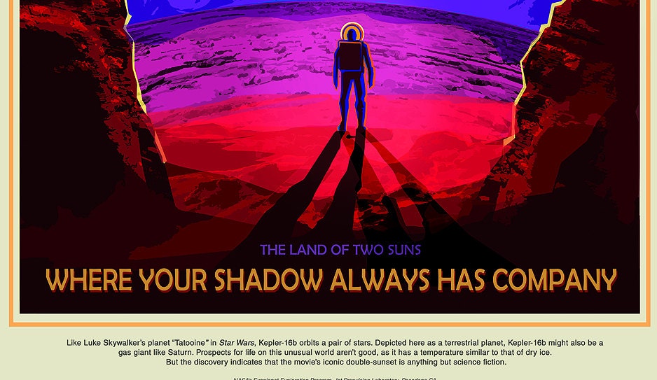 Like Luke Skywalker's planet "Tatooine" in Star Wars, Kepler-16b orbits a pair of stars. Depicted here as a terrestrial planet, Kepler-16b might also be a gas giant like Saturn. Prospects for life on this unusual world aren't good, as it has a temperature similar to that of dry ice. But the discovery indicates that the movie's iconic double-sunset is anything but science fiction.