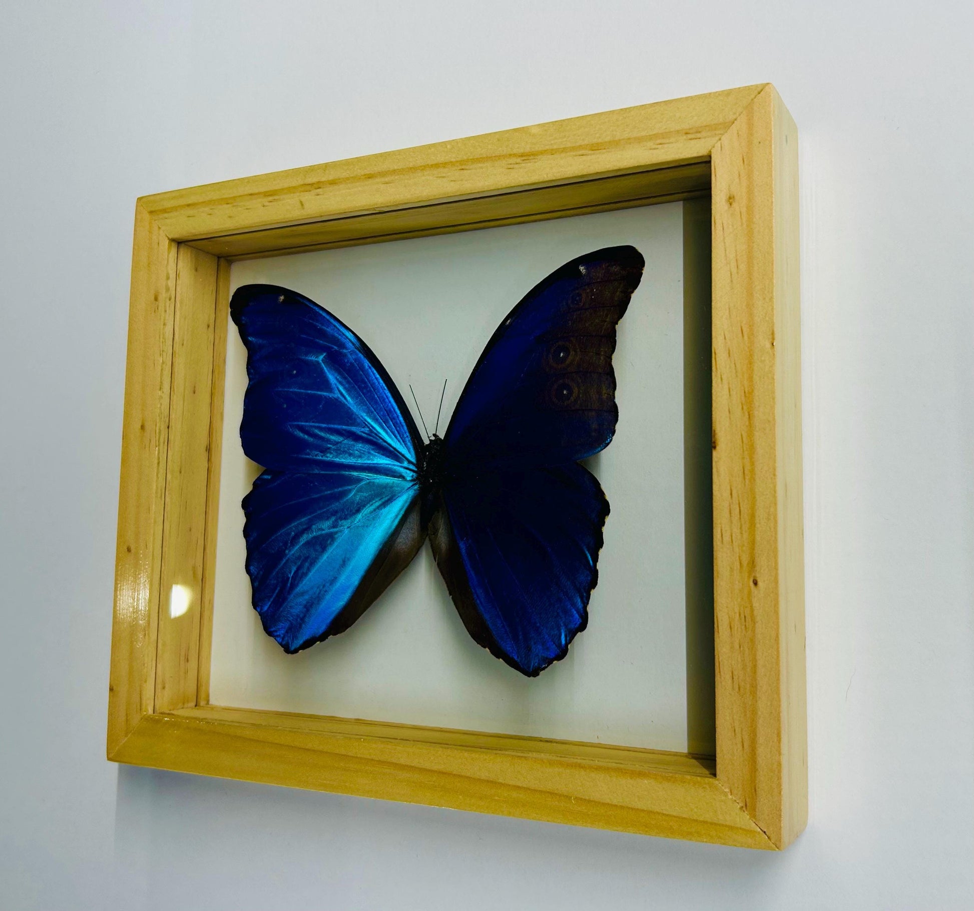 Nautural wood finish.Size:7.3/4 x8 inches Large Blue Morpho(6 inch wingspan) Specimen Framed in Double Glass Shadow Box. This Amazonian butterfly specimen is mounted in a double glass shadow box.The double glass shadow box allows you to appreciate both the front patterns as well as the back patterns of the butterfly witch can be radically different. This Rustic framed butterfly adds a great decorative touch to any living room, office or study. Also makes a fantastic high quality gift on any occasion. For any questions feel free to send me a message.Ships with 3 layers of protection for a guaranteed safe arrival. Full refund if damaged in transit.