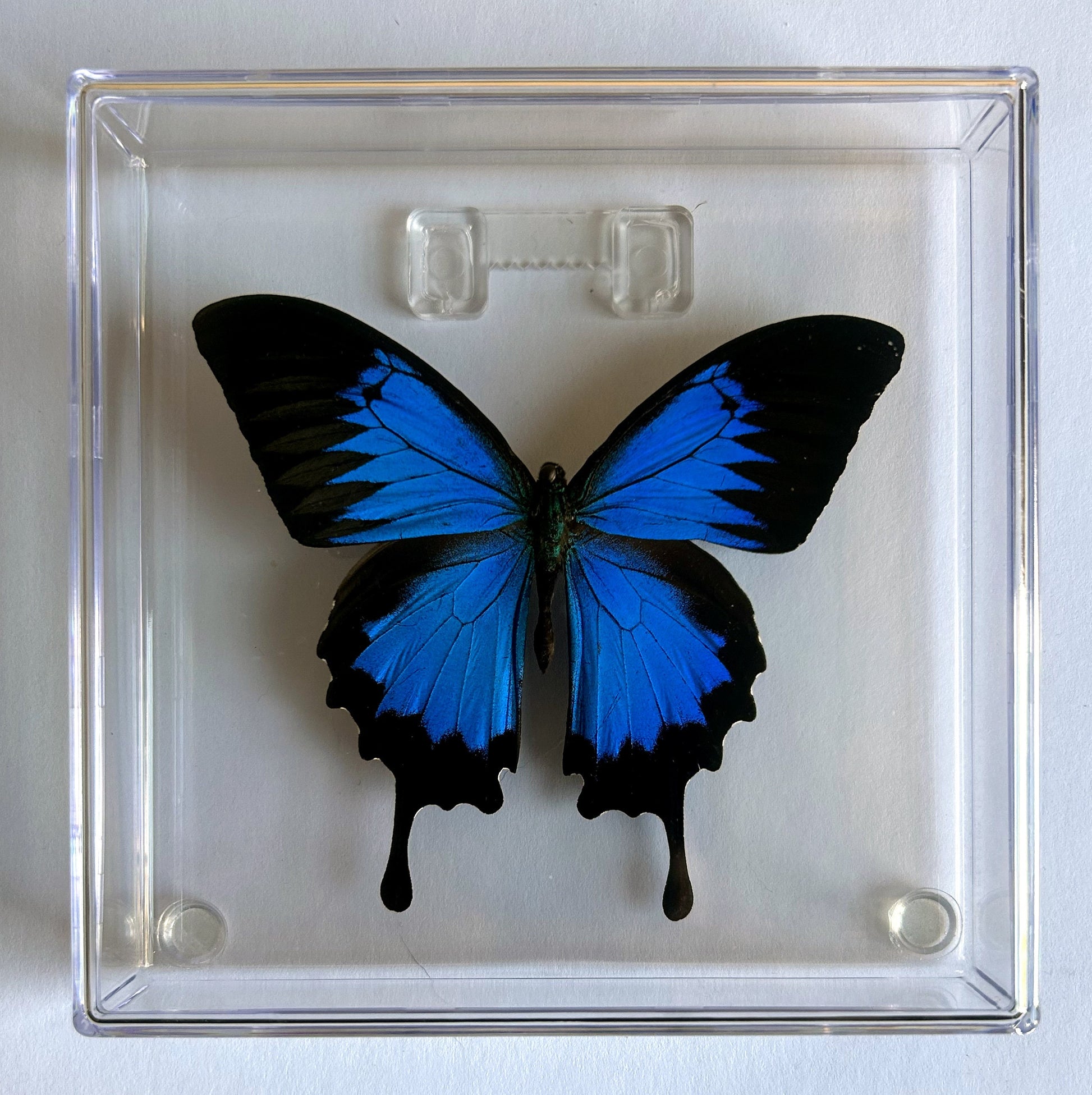 Ulysses butterfly specimen sealed in Acrylic frame.6x6 inches.(INCLUDES PRE-INSTALLED CLEAR HANGER & CLEAR RUBBER BUMPERS FOR WALL MOUNTING)